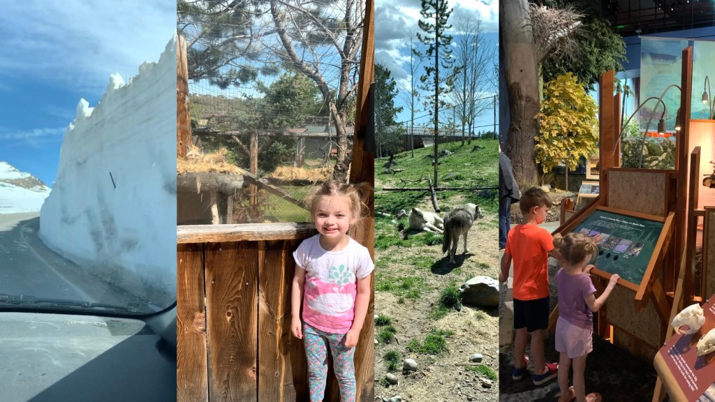 Left to Right: Beartooth Pass with snow walls, Yellowstone Wildlife Refuge, some wolves at the Grizzly & Wolf Discovery Center and the Draper Natural History Museum at the Buffalo Bill Center.