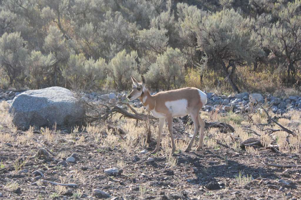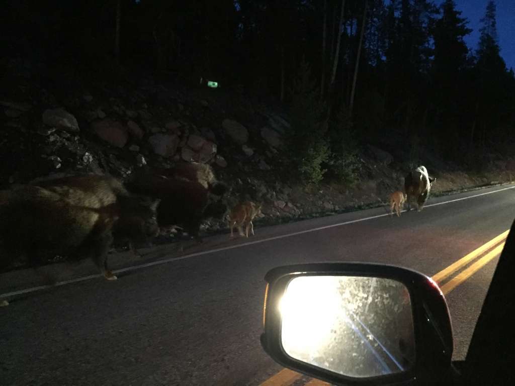You have to be patient when trying to post wildlife. Once we saw wolves at a far distance up on a hill. A huge crowd had formed and we managed to snag a parking spot and joined in but just could not spot anything – someone said see that spot that looks like a rock, that’s one. So I thought I had it and got a photo, zoomed in and…the spot I found was an actual rock! So we left and went further into the valley to see what else we could find before it got dark. On our way back through we saw there were still people up there so we tried again. This time when almost everyone had left we got to see them stand up and move! Even though they were tiny it was still neat to see! Earlier when we couldn’t spot them I caught the tail end of a coyote being chased by a small herd of pronghorn!! I wouldn’t have believed it if someone else next to me hadn’t confirmed that they saw the same thing. No one else seemed to catch it because they were all try to spot the wolves. My husband has always joked that we probably miss amazing things when we are so focused on watching something else. There is seriously so much wildlife to see in this park!! We also saw the female moose, a grizzly, and a red fox on the road up to the NE entrance. There was another time when way way off in the distance and with the help of someone else’s scope we saw a grizzly munching on a bison carcass. There were lots of people excitedly waiting around because that is usually when the wolves come in but because it was so far away my kids couldn’t really see, and getting dark, we left to go spot other things. But if you ever see or hear of a carcass that is an area where you are more likely to see the predator animals.