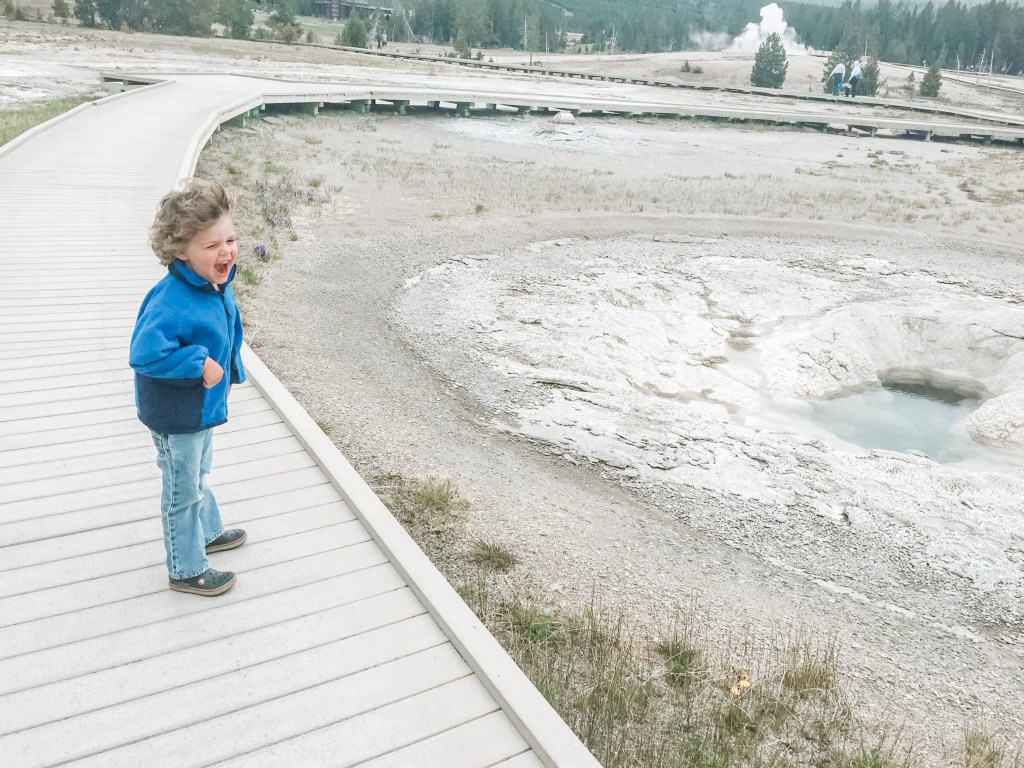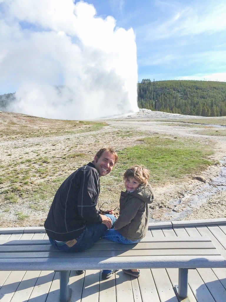 My oldest when he was younger in front of the Grand Prismatic – as you can see as soon as you step off it’s a thermal area! It’s really amazing to see though if you can work it out in a way that feels comfortable with your family and schedule.Morning Glory Pool – I love all of the colors with these pools!These boardwalks are about a mile away from Old Faithful in the Upper Geyser Basin area. This is where we saw the Morning Glory Pool. It would still not be safe to step off the boardwalk but most of it is a little further away. It is a fun trail to do before or after seeing Old Faithful.Old Faithful – at 8am, end of May in 2015. We were one of the only ones there. It has gotten much more crowded but it is also sure to be crowded in the summer. So if you go a bit more off season you may beat some of the crowds.