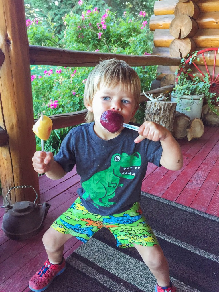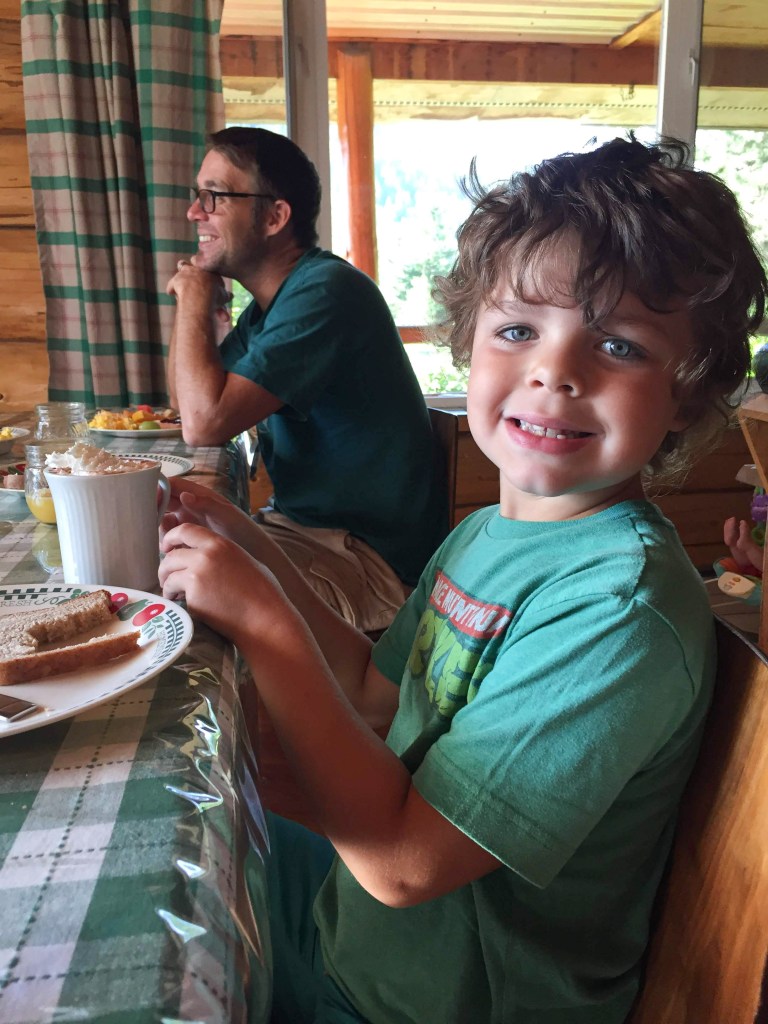 Double fisting his popsicles! (he was tasting his brother’s)Common area in the houseBreakfast time and chatting with Al & Daryl. 🙂Breakfast – homemade smoothies, fruit, eggs, baked goods – this time scones, another time we had coffee cake. Some sort of protein. This time was ham another time was sausage. They have lots of beautiful flowers all around.