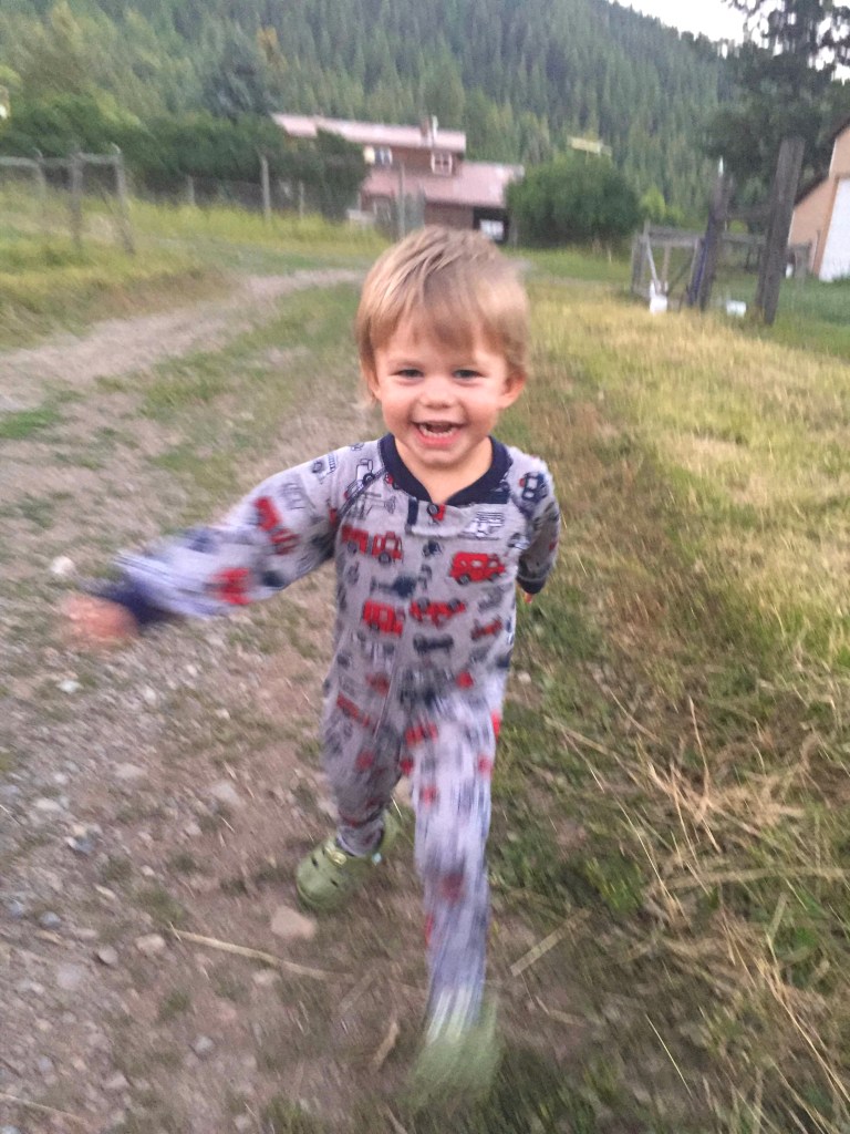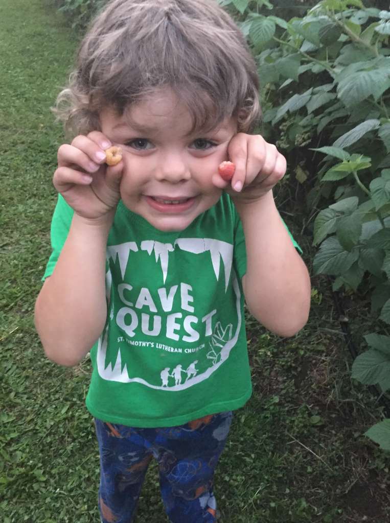 This guy misses our cats at home a lot when we travel so he loved getting some kitty snuggles!Morning snuggles on the porch. I would set my alarm to wake up early because I loved sitting out there in the peace and quiet before everyone else woke up.This sweet kitty came on our walk with us.Summer evening raspberry pickingMore raspberry picking with a new friend they made