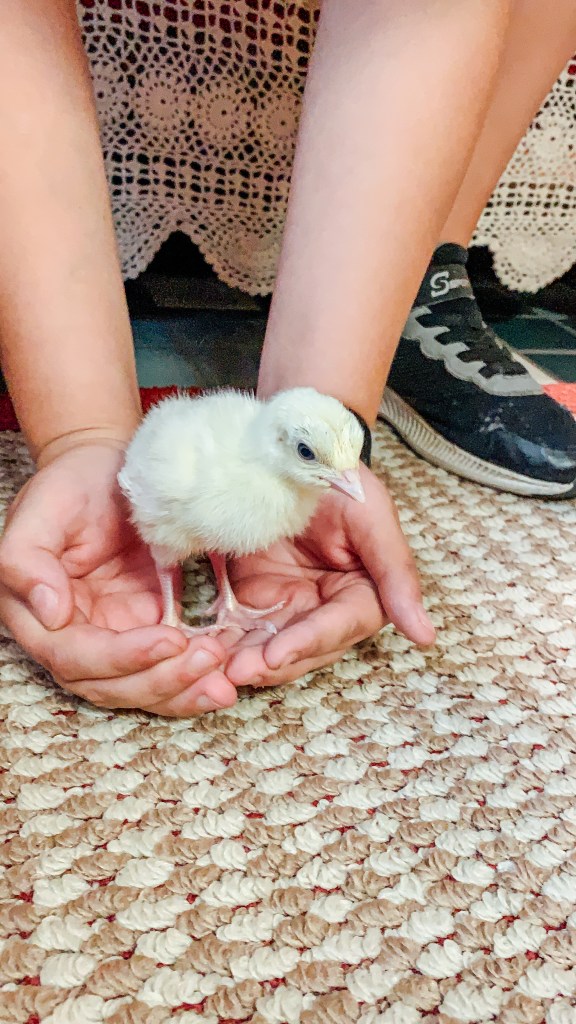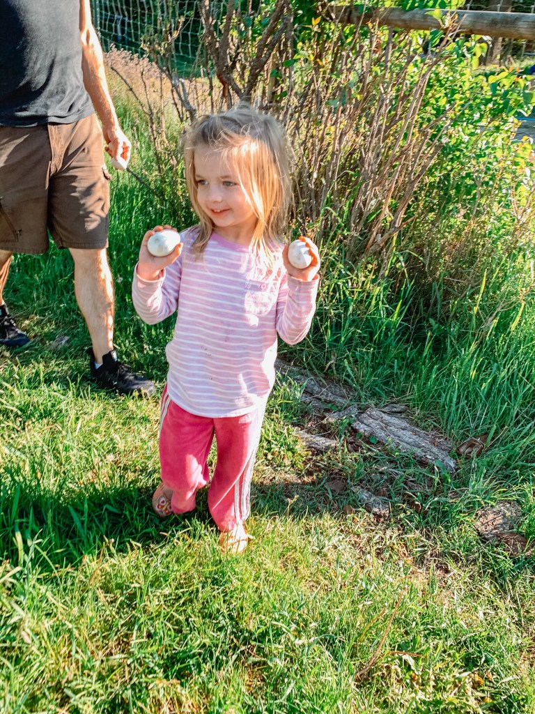 kissing baby bunnies!The kids had fun seeing the new turkey poultHappy little egg collectorThey loved picking grass to feed the goats. They were also given leftovers like banana peels to feed them.They would run out first thing (still in jammies) to go see the animals.