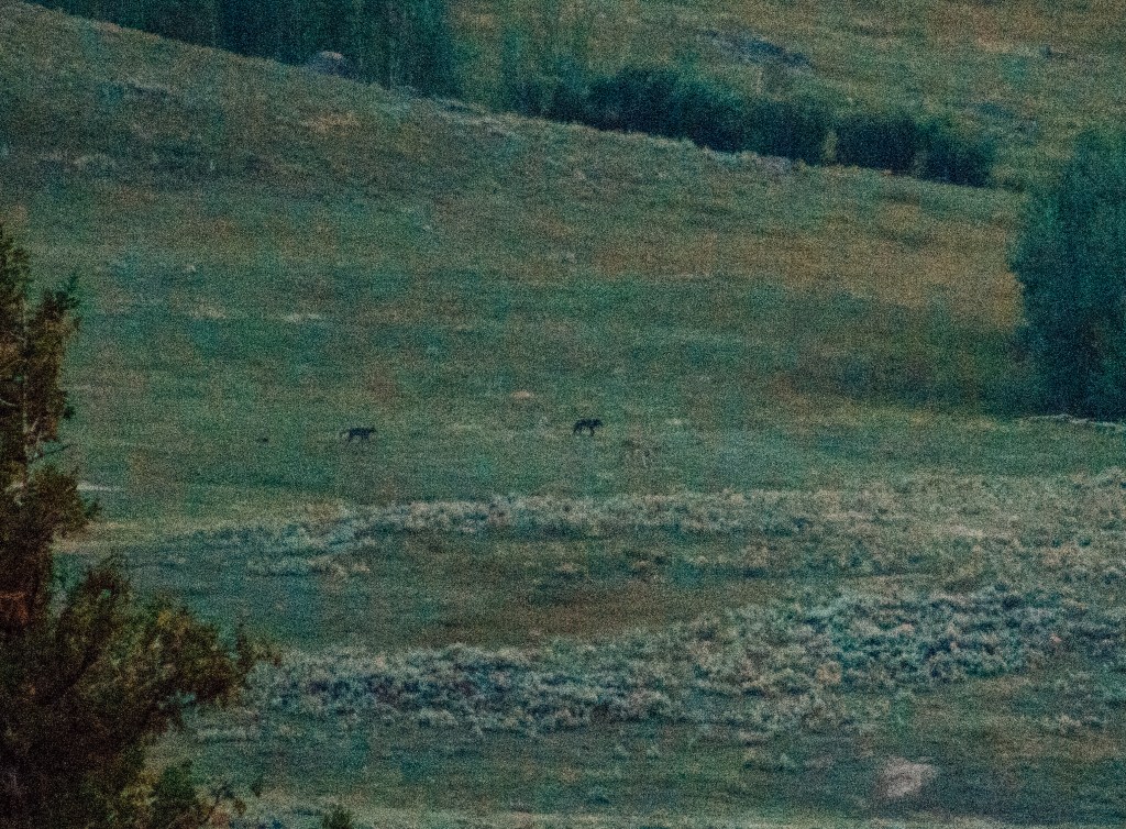 The wolves – it was nearing dark so I had to lighten the photo a lot. We could see them a bit bigger in the binoculars and it was still so neat to see them even though they were far away.